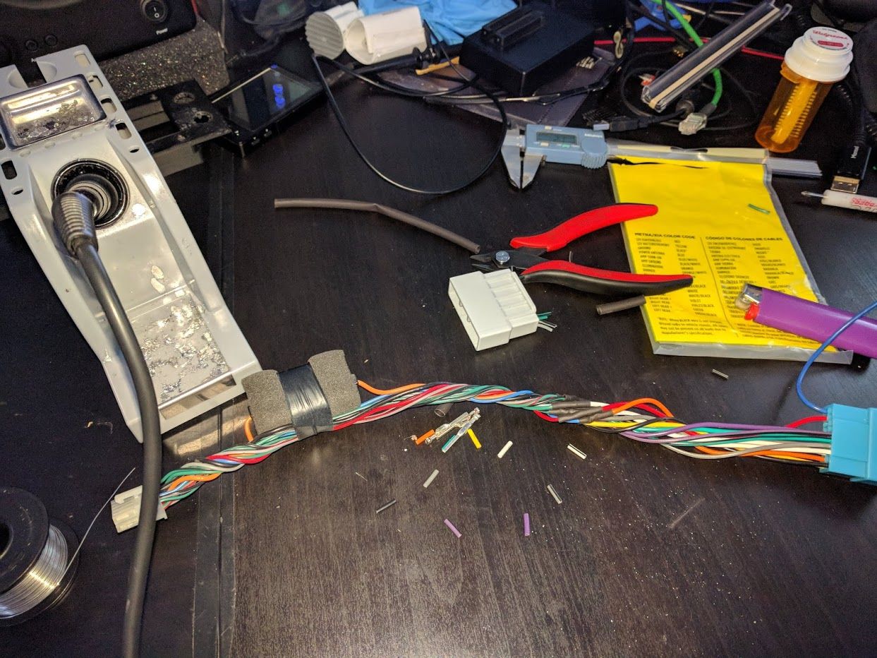 Yeah, I later decided against doing that too, so instead I depinned each of the speaker pairs and twisted each one independently, then leitz braided the ground, batt, key, and dimmer together. You know, because it'd bother me otherwise, lol...